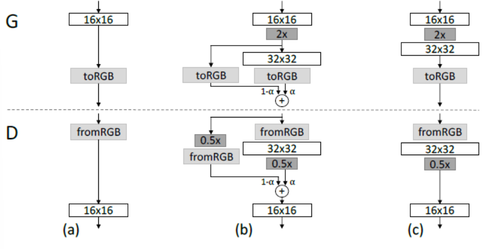 또한 이 해상도를 바로 도입하지 않고 0과 1 사이의 알파 파라미터를 사용해 고해상도에 새 층을 단계적으로 도입한다. 알파는 이전 층을 업스케일한 층과 전치 합성곱으로 커진 층을 얼마나 사용할지 결정한다. D에서는 0.5배로 감소시켜 판별자에게 훈련된 층에 부드럽게 주입되게 한다. 새로운 층에 확신이 생기면 (c) 처럼 32 x 32 를 남기고 적절하게 32 x 32 크기를 훈련한 후 대시 해상도를 늘린다.