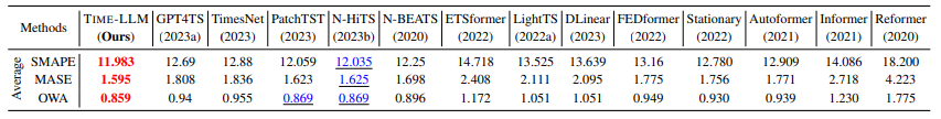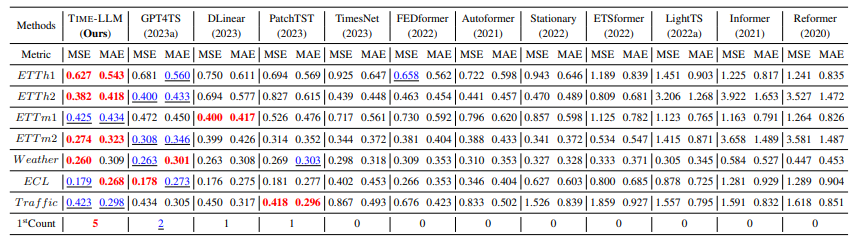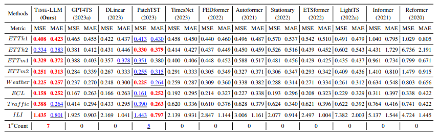 Time-LLM은 여러 벤치마크와 설정, 특히 few-shot, zero-shot 시나리오에서 최첨단 예측 방법을 지속적으로 큰 폭으로 능가했다. Time-LLM의 성능평가를 위해 최근 연구를 포함한 광범위한 최신 모델들과 비교하였다. 또한 비교에서 Long-Term Forecasting과 Short-Term Forecasting을 나누어 각각의 dataset과 평가지표를 설정하여 평가하였다.