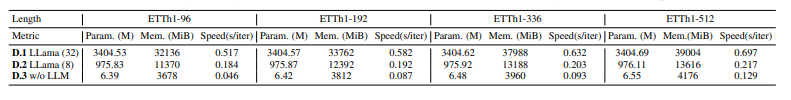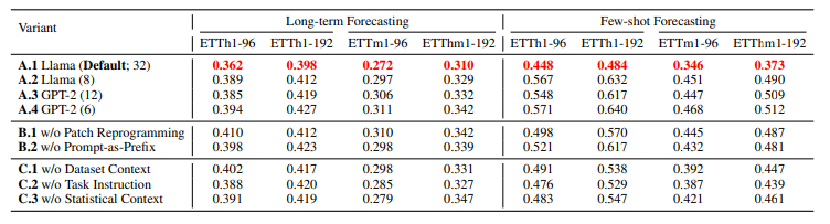 이번엔 (A) 각각의 LLM 모델에 대해 성능을 평가하고 (B) Patch Reprogramming이나 Prompt-as-Prefix 기능 없이 예측한 성능과 (C) Prompt-as-Prefix 단계의 각각의 부분 없이 성능을 평가한 결과이다.