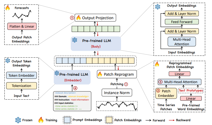 Time-LLM 논문에서 제시하는 TS data를 처리하는 구조는 다음과 같다. TS data는 먼저 Instance Norm, Patching, Patch Reprogram, Pre-trained LLM(Body), Output Projection 순으로 처리된다.