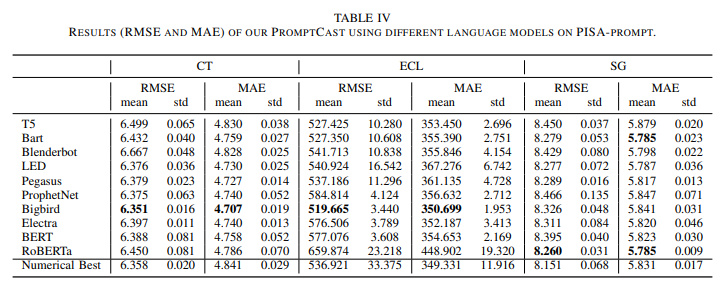 위 표는 PISA numerical 데이터셋을 이용하여 수치 기반 시계열 예측을 수행한 여러 모델들의 성능 결과를 나타낸 것이다. 표에서 RMSE와 MAE는 모델의 성능을 측정하는 지표로 사용되었으며 세 가지 시계열 예측 과제에서의 성능을 평가하고 있다. 평가한 모델들로는 전통적인 모델부터 Transformer 기반 모델들까지 모두 평가하였다. 결과를 보면 비교적 최신 모델들인 Transformer 기반 모델들이 나머지들에 비해 더 나은 성능을 보여준다.