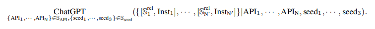 API를 이용하여 명령을 생성하기 위해 먼저 전체 API 집합인 SAPI에서 일부 API들을 샘플링하여 작은 하위 집합 $S_{n}$을 만든다. 이 하위 집합에는 여러 API들이 포함된다. ChatGPT에게 이러한 API 기능을 이해하도록 하고, 그 후에 API를 포함하는 명령을 생성하고, 각 명령에 관련된 API들의 집합$S_{rel}$을 생성하게 한다. 즉, [$S_{rel1}$, $Inst_{1}$], [$S_{rel2}$, $Inst_{2}$], [$S_{rel3}$, $Inst_{3}$] ,... 와 같은 형태로 명령과 관련된 API들이 쌍으로 생성된다. 이러한 API 쌍은 나중에 API Retriever를 훈련시키기 위해 사용된다.