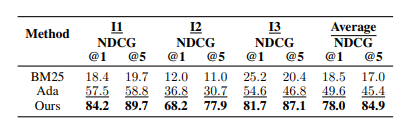 API 검색기의 성능 평가는 다음 그림에서 확인할 수 있듯이 모든 설정에서 기준 모델들보다 우수한 성능을 보였다. 특히 단일 Tool 명령에서의 NDCG 점수가 I2, I3보다 높았는데 이는 단일 Tool 검색이 다중 Tool 검색보다 더 간단하다는 것을 의미한다.