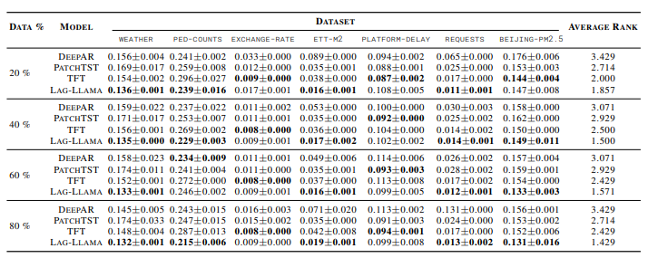 이 표는 각 모델의 few-shot 적응 능력을 평가한 표이다. 실험에서는 데이터셋의 훈련 세트에서 마지막 K%의 데이터만을 사용하여 실험을 진행하였다. 지도 학습 모델들은 해당 데이터에서 처음부터 훈련을 시작했지만, Lag-LLaMA는 사전 학습된 모델을 Fine-tuning 하여 평가하였다.