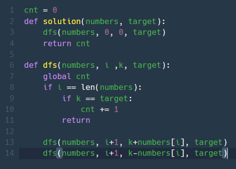 문제에도 bfs/dfs라 쓰여 있어서 먼저 dfs로 풀려고 접근하였다. 일단 모든 number를 사용해야 하므로 모든 number를 거친 것인지 확인하고 모두 거친 것이라면 해당 값이 target과 같은 값인지 확인하도록 하였다. 여기서 어떻게 같은 것들의 개수를 저장할 지 고민했는데 이 부분에 대해서는 잘 몰라서 찾아보았다. 찾아보았을 때 global 변수로 선언하여 해결할 수 있었다.