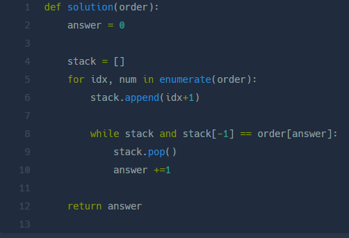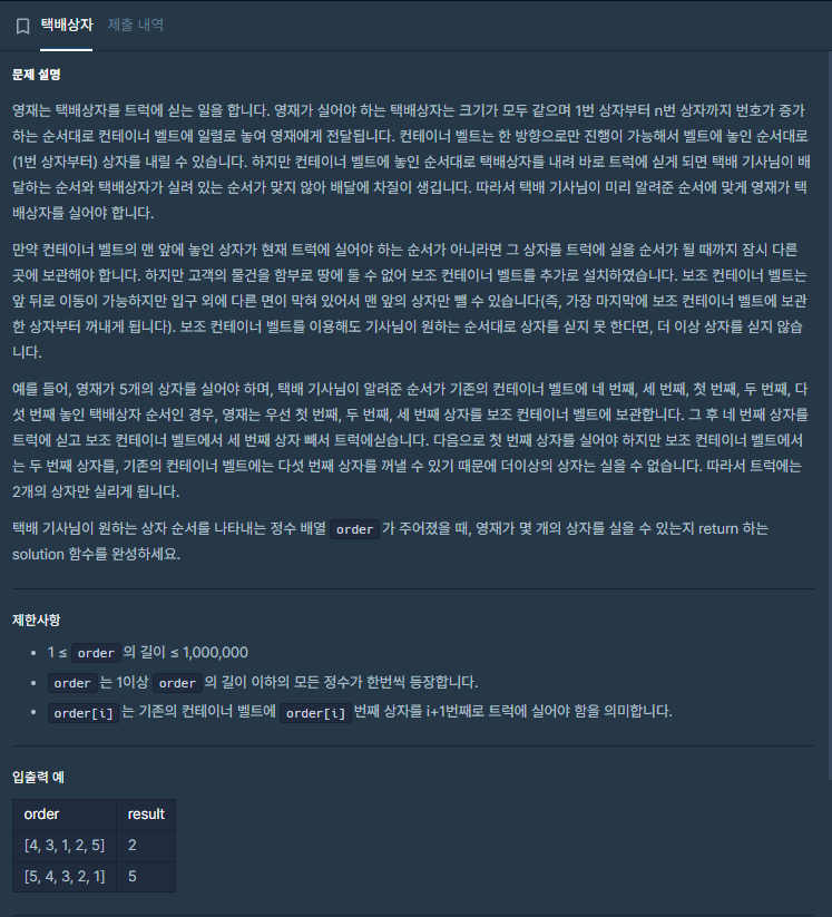 기사님은 택배를 순서대로 꺼내기 때문에 인덱싱은 1부터 확인하면서 만약 order의 인덱스와 같은 수라면 트럭에 싣는다. 만약 다르다면 stack을 확인하고 stack이 비어있으면 넣고 stack이 비어있지 않으면 맨 마지막 요소를 확인하고 해당 요소가 실어야 하는 order의 인덱스보다 작다면 stack에 추가하고 같다면 stack에서 pop 한다. 모두 만족하지 않을 경우에는 break한다. stack 구조와 order의 요구에 대해 차근차근 접근하다보면 해결할 수 있는 문제였다.