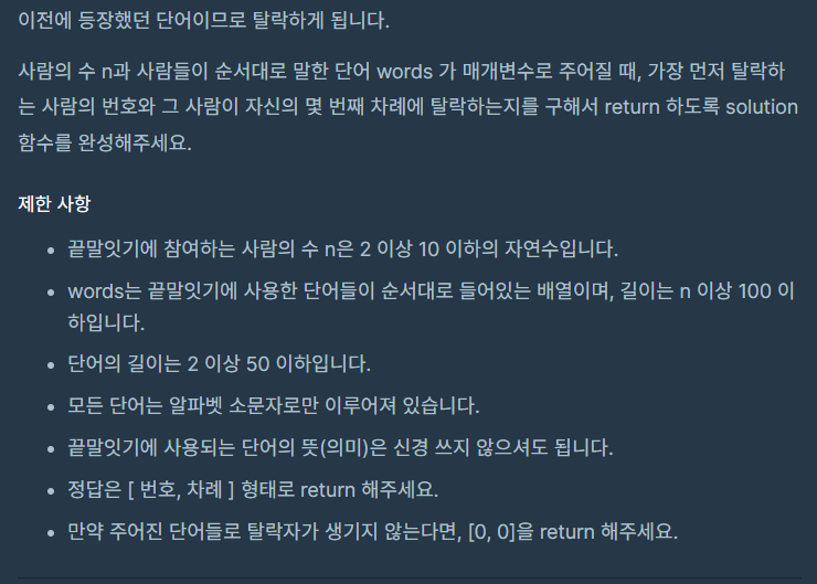 어릴 때 자주하던 영어 끝말잇기 놀이와 똑같다. 앞사람이 말한 마지막 단어로 시작하지 않으면 탈락, 나왔던 단어를 다시 말하면 탈락. 만약 주어진 words에 탈락하는 경우가 없다면 [0,0]을 반환하도록 한다. 쉽게 해결하였다.