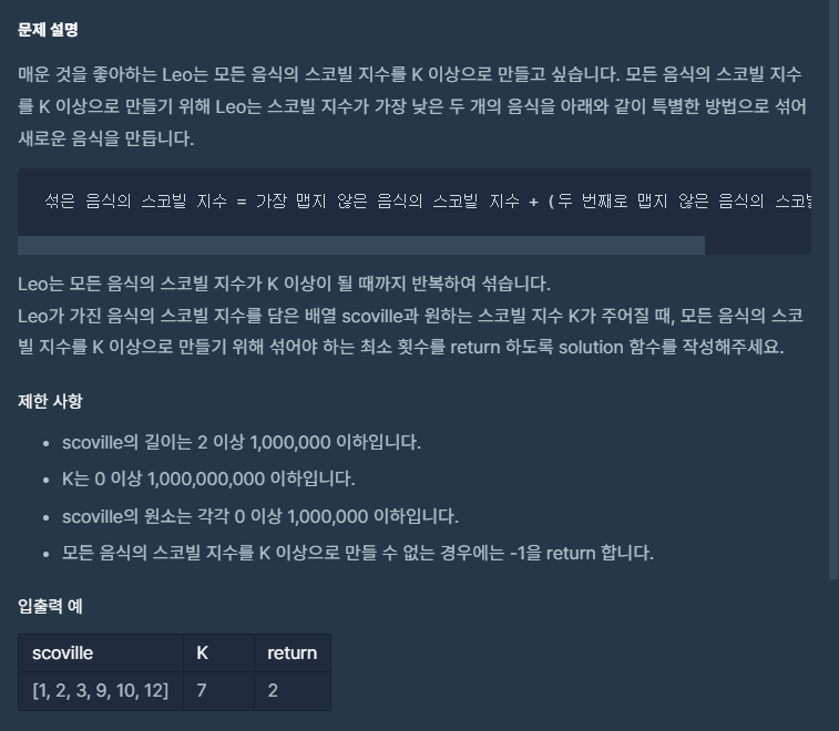 가장 작은 두 값을 섞어 새로운 스코빌 지수를 가진 음식으로 만드는 것을 반복하는 문제이다. 작은 값 두 개를 찾는 것을 MIN으로 찾기에는 시간이 부족할 듯하여 heap을 사용하여 해결하였다. 18번 케이스에서 막혔는데 만약 처음부터 가장 작은 스코빌 지수의 음식이 K보다 높은 지수라면 굳이 while문을 돌릴 필요 없이 해결할 수 있다.