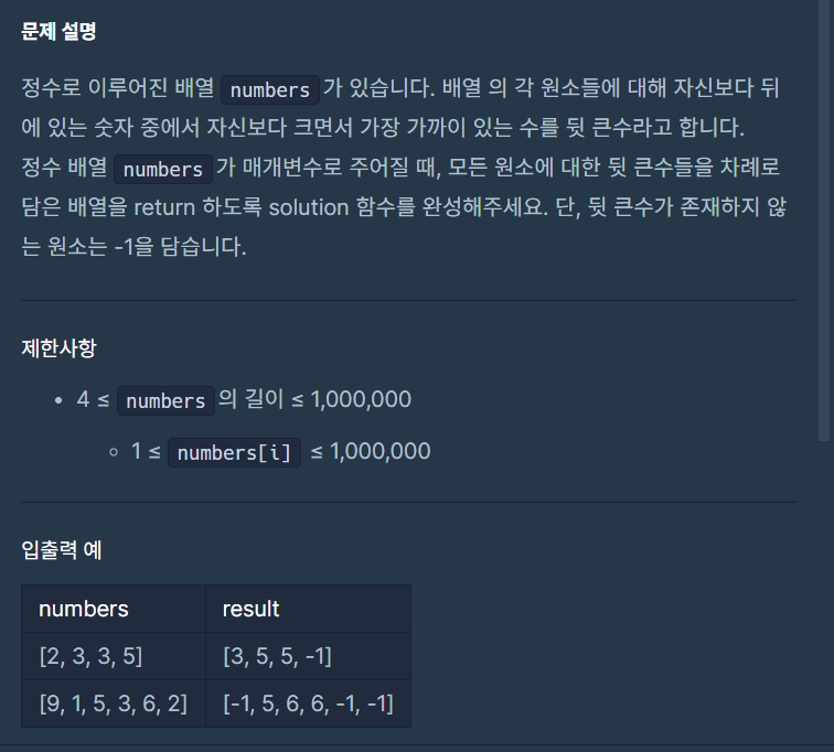 자기 자신보다 뒤에 있는 수 중에서 가장 가까운 수로 치환하는 문제이다. 처음에는 인덱싱을 이용해서 확인하는 인덱스와 그 뒤에있는 배열을 잘라 비교하면서 해결하려 했지만 이 방법은 이중 for문을 사용하는 꼴이 되어 시간 초과 문제가 발생하였다. 따라서 스택을 사용해서 큰 수를 저장하고 확인하는 값이 스택의 마지막 값보다 크면 큰 수를 현재 숫자로 업데이트하고 이전 수를 pop으로 제거하는 방법을 통해 해결하였다.