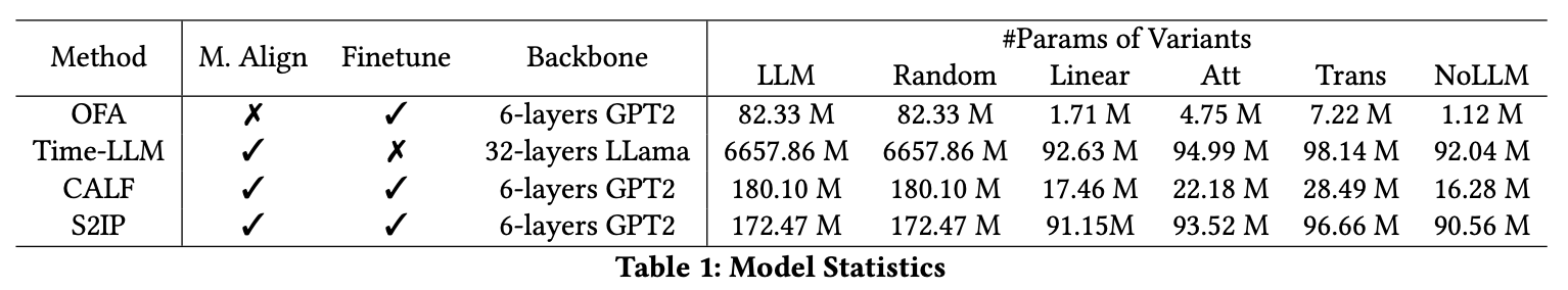 제안한 모델의 Long Term Forecasting 을 실험하였다. 실험한 결과, One-Fits-All을 제외한 모델들은 LLM을 백본으로 사용했을 때의 이점이 전혀 드러나질 않았다. 오히려 간단한 Linear, Att, Trans 구조가 LLM과 동등하거나 더 좋은 성능을 보인다. 즉, LLM의 거대 언어 지식은 시계열 예측 성능을 실질적으로 향상시키는데 도움이 되지 않는다. 저자들은 시계열 데이터는 본질적으로 sparsity와 periodicity가 강하므로 언어 모델의 복잡한 추론 구조보다 단순한 구조가 더 적합할 수 있다고 해석한다.