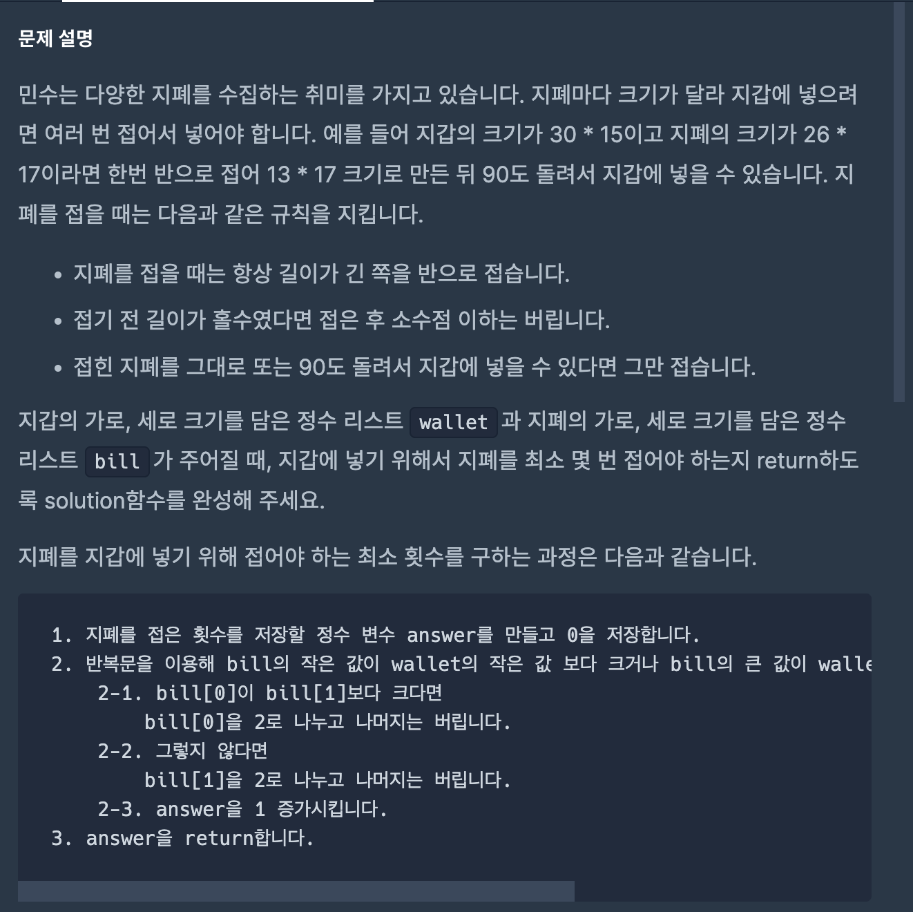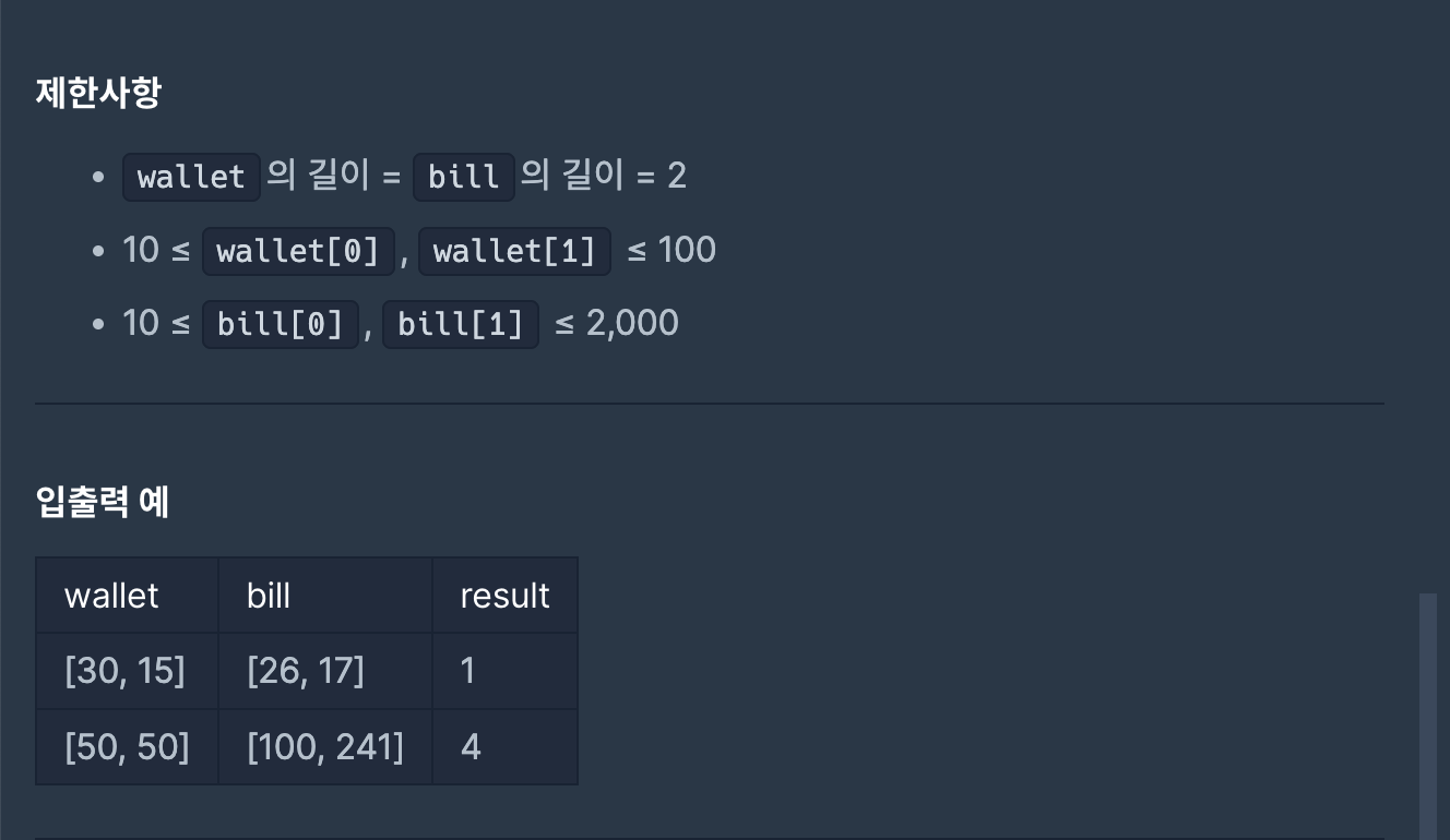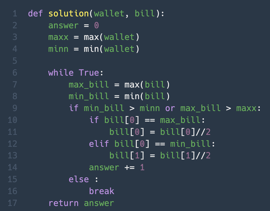 의사코드처럼 wallet의 큰값보다 큰 bill이 있으면 그거 나누고 작은게 있으면 또 작게 만들어서 어쨌든 wallet에 bill이 들어갈 수 있도록 구현하면 된다고 생각했고 wallet과 bill의 최대 최소값을 비교하여 해당 의사코드를 수행하도록 구현하였다.